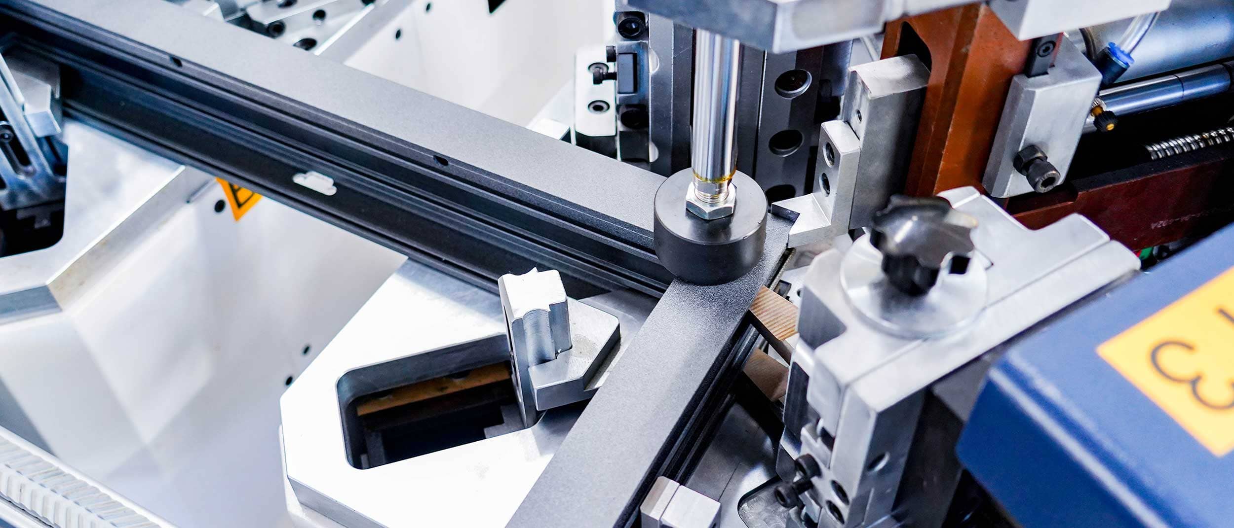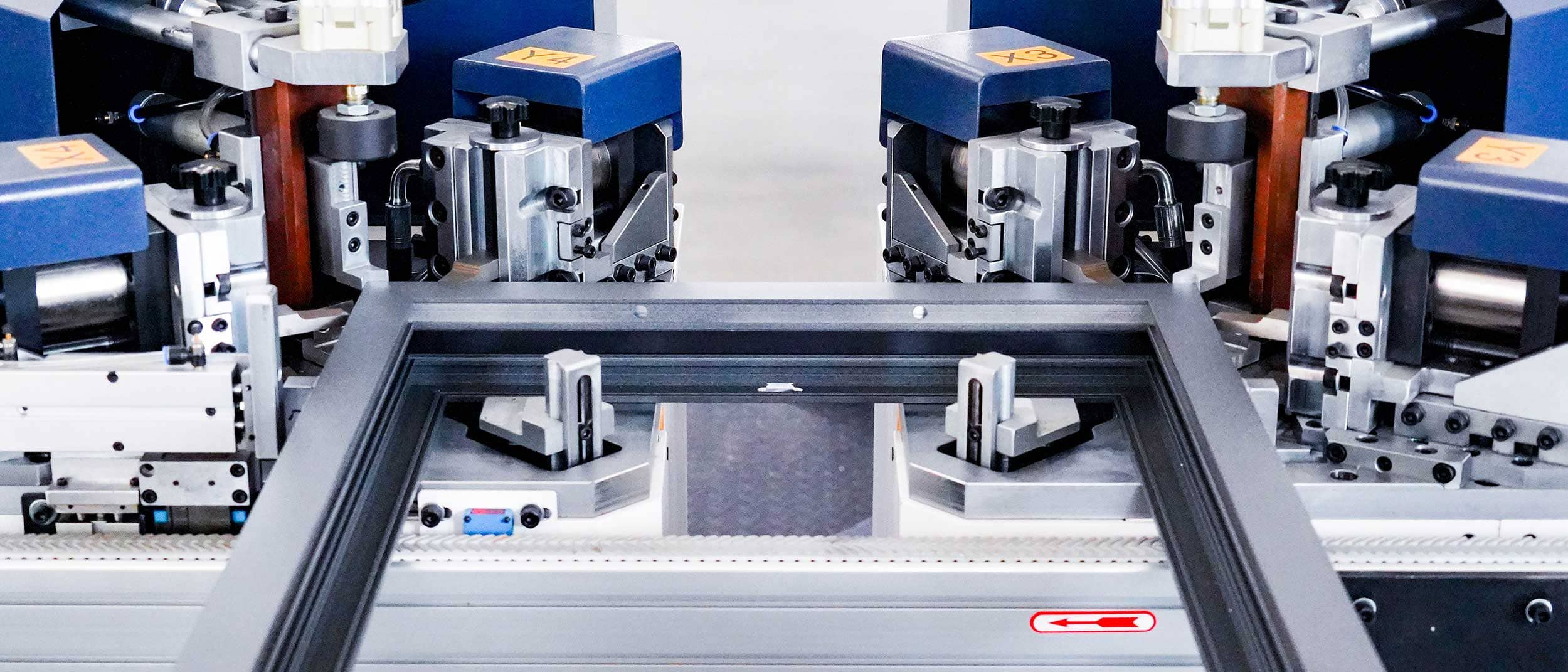 Barite 150 – интеллектуальная линия по производству угловых обжимок с 4 головками для алюминиевых дверей и окон может выполнить штамповку угловых планок и клепальное соединение всех четырех углов за одну операцию.